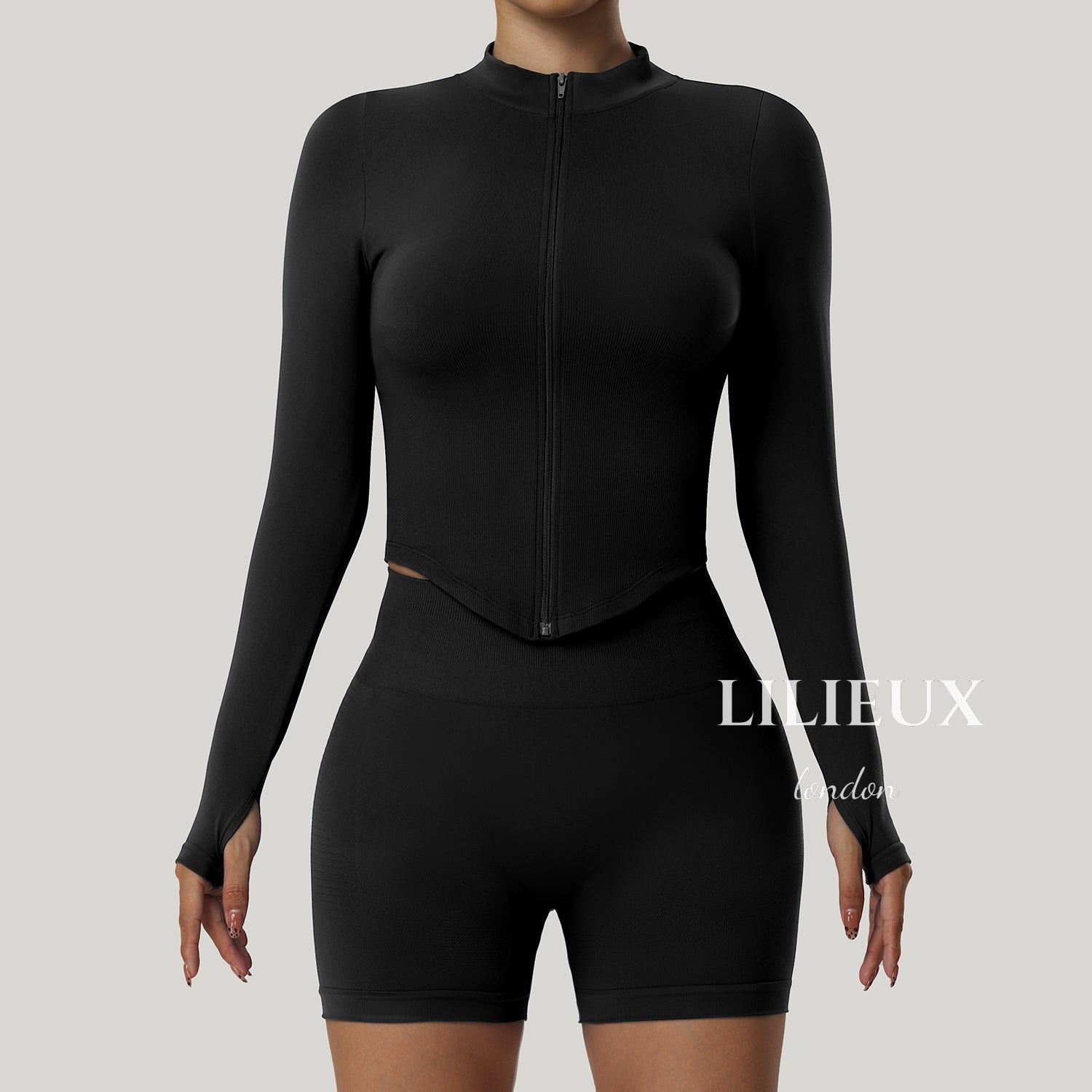 Long Sleeve Zipper Top: Fitted top with a functional front zipper and thumb holes, offering both style and practicality.